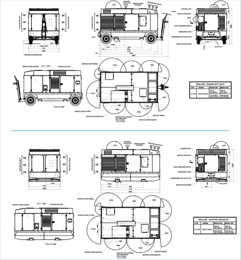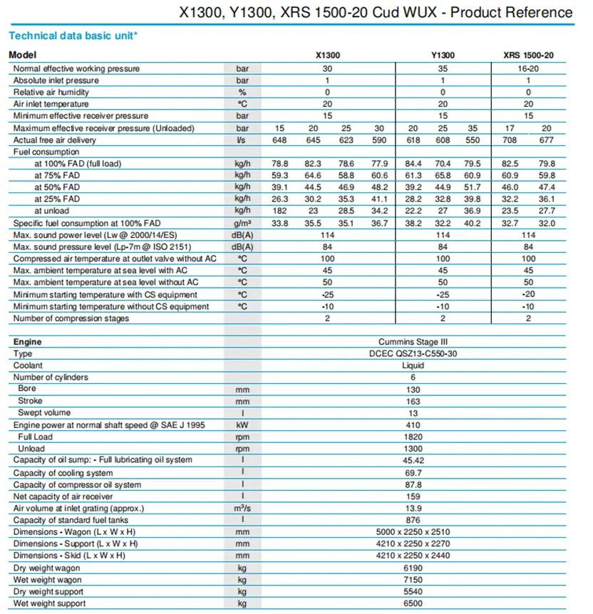 Atlas Copco X1300, Y1300 və XRS 1500-20 maye soyudulmuş, altı silindrli Cummins dizel mühərriki ilə təchiz edilmiş, susdurulmuş, iki mərhələli, yağ vurma vintli kompressorlardır.